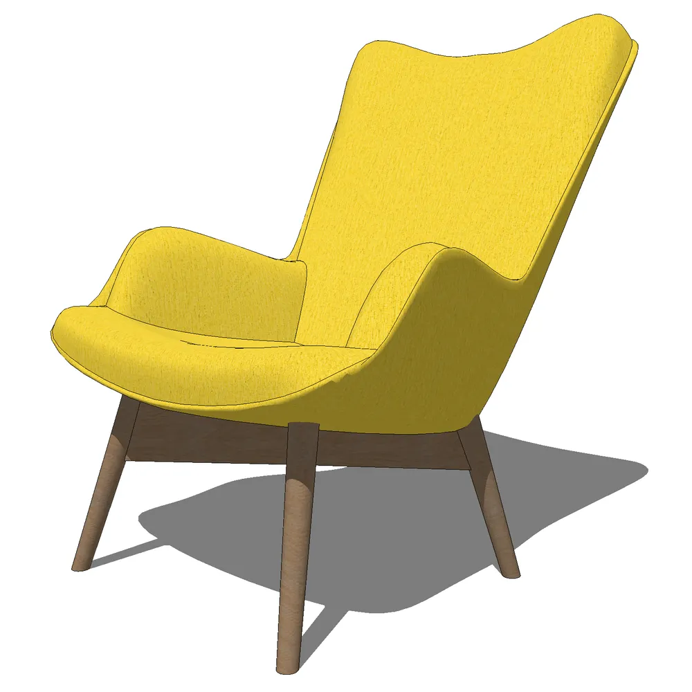 This mid-century modern armchair 3D model features a vibrant yellow fabric upholstery and walnut legs, perfect for adding retro-inspired comfort to contemporary interiors. Its clean lines and ergonomic design make it ideal for residential and commercial spaces.