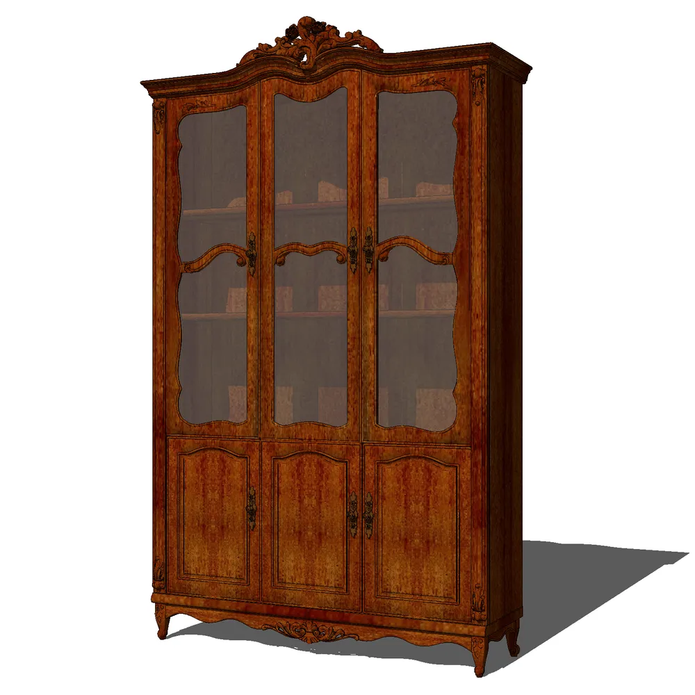 This ornate classical glass display cabinet features hand-carved floral motifs, arched panel doors, and antique brass hardware. Crafted with realistic wood grain textures and beveled glass panels, it adds timeless elegance to luxury interiors while maintaining SketchUp performance standards.