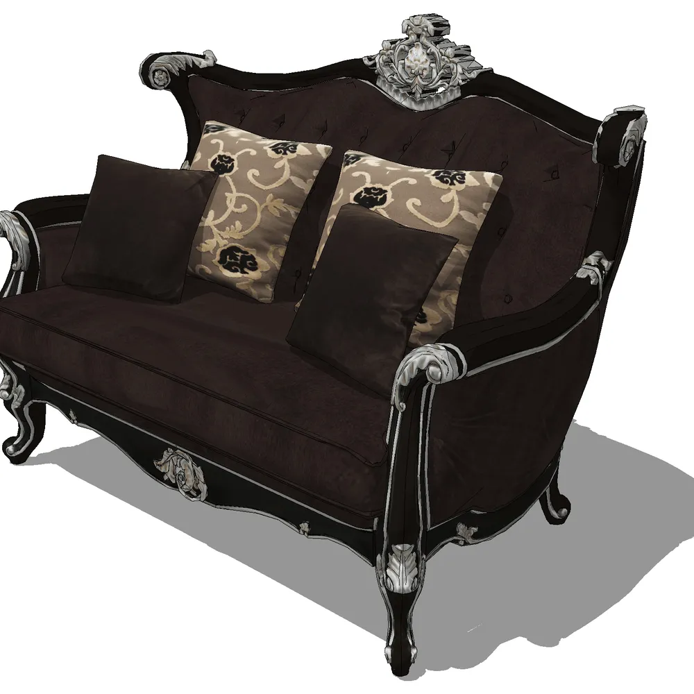 This exquisite baroque-style sofa 3D model showcases intricate silver leaf carvings, dark velvet upholstery, and hand-embroidered cushions. Its symmetrical armrests and clawed feet完美 replicate 18th-century craftsmanship, ideal for luxury interior design projects requiring historical accuracy.