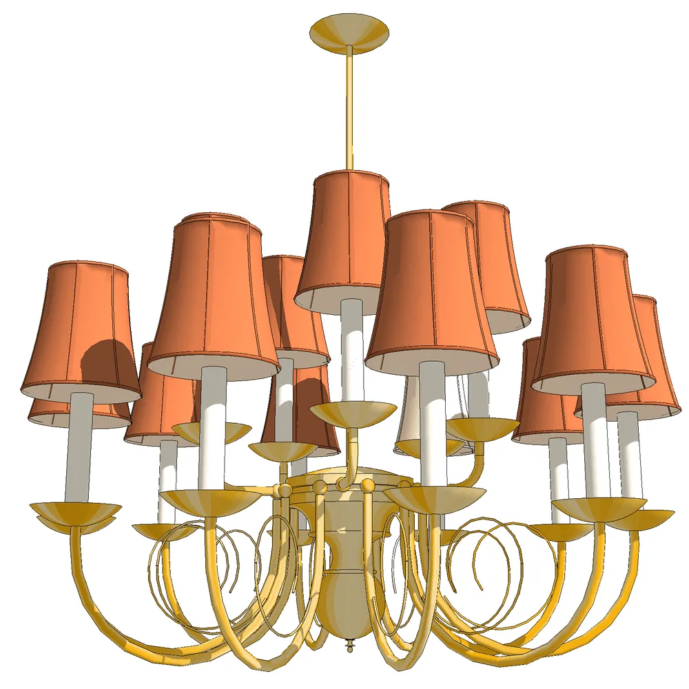 This modern pendant light features a gold frame with spiral arms and an orange fabric shade, making it an ideal choice for enhancing architectural visualizations. The SketchUp model includes detailed textures and modular components for easy customization.