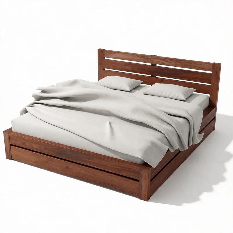 Modèle SketchUp de cadre de lit en bois moderne élégant avec tiroirs de rangement intégrés et textures de bois photoréalistes. Optimisé pour D5render, Enscape et Vray avec une taille de fichier légère de 1,3 Mo, idéal pour des visualisations réalistes de design de chambre à coucher.