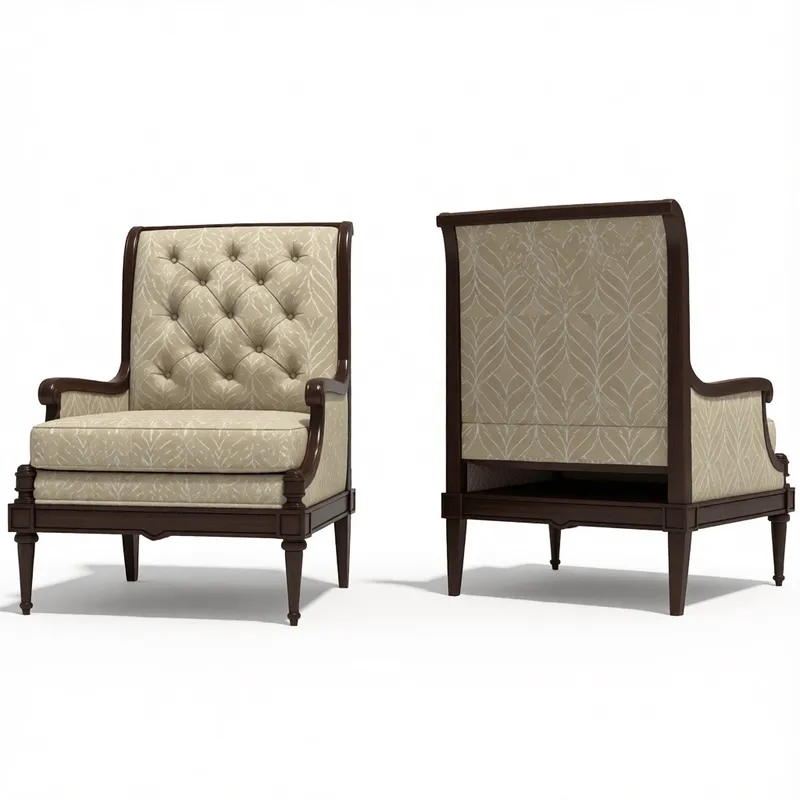 この精密に作られたアメリカンスタイルのアームチェアのSketchUp 2021用3Dモデルは、エレガントなタフティング加工の張り地、ダークウッドのフレーム、軽量な4MBのファイルサイズが特徴です。D5Render、Enscape、Vrayに最適化されており、写実的なテクスチャと精密なディテーリングを実現し、住宅内装ビジュアライゼーションプロジェクトに最適です。