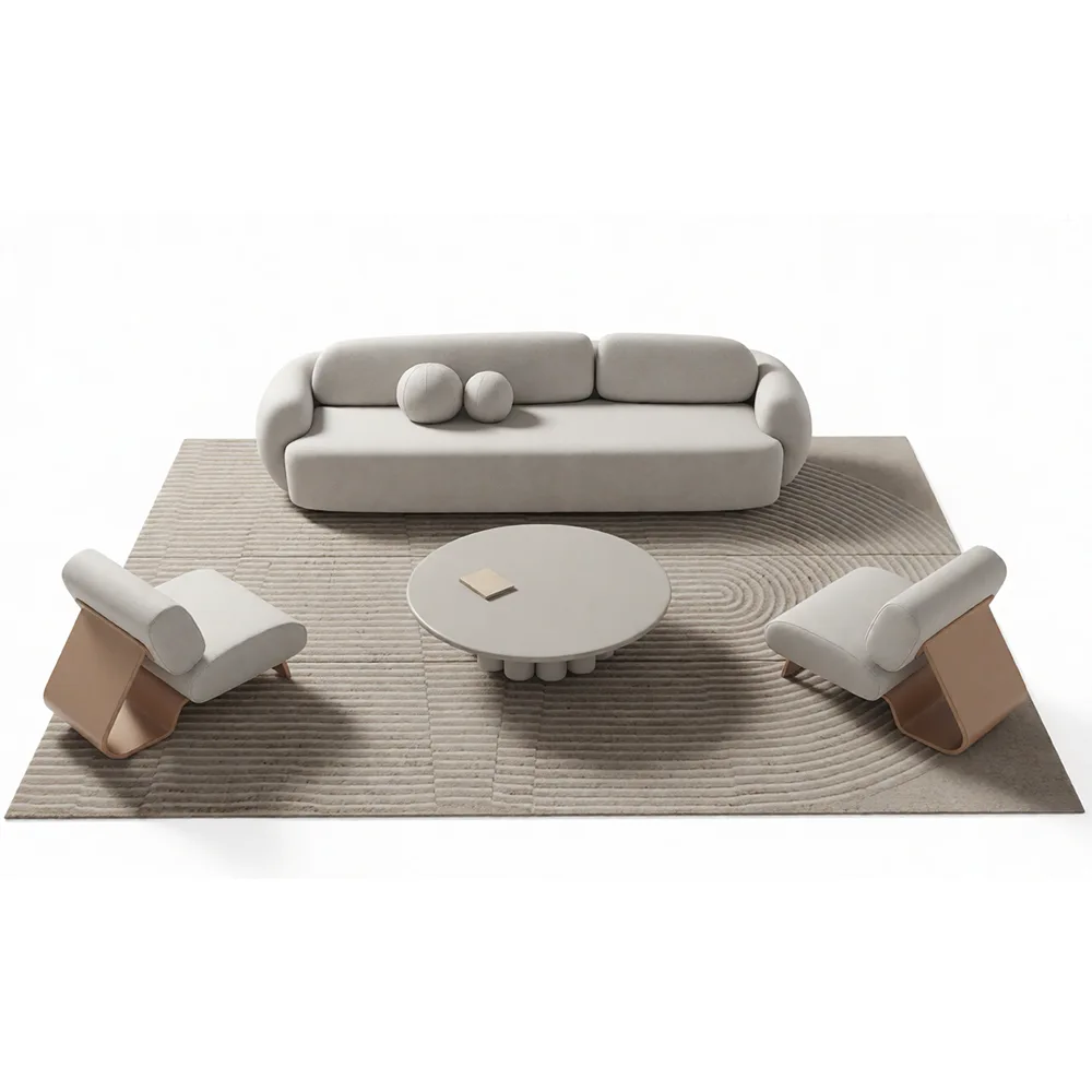 この現代的なリビングルームセットは、丸みを帯びたアームレストを備えた流線型ソファ、2つのアクセントチェア、円形コーヒーテーブルで構成されています。SketchUp 2021に最適化され、D5render、Enscape、Vrayとの互換性を有する13.0MBのモデルは、写実的なテクスチャとクリーンな幾何学形状を実現し、現代的なインテリアビジュアライゼーションプロジェクトに最適です。