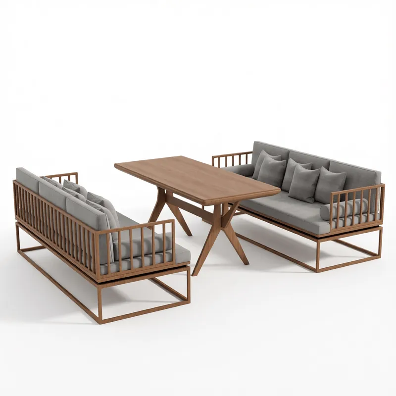 このモダンな木製ソファセットは、幾何学的なラインを基調とし、自然木のフレームと豪華なグレーの生地張りを特徴としています。SketchUp 2021に最適化されており、D5render、Enscape、Vrayとの互換性を備え、建築ビジュアライゼーションプロジェクトにおいてフォトリアリスティックな質感とパフォーマンス効率を両立します。
