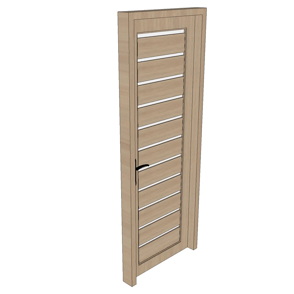 This precision-built modern horizontal bar wood door features a clean linear design with six evenly spaced panels and streamlined black knobs.The SketchUp model includes adjustable woodgrain textures with precise dimensions, making it especially suitable for interior architectural visualization projects that require highly detailed space planning components.