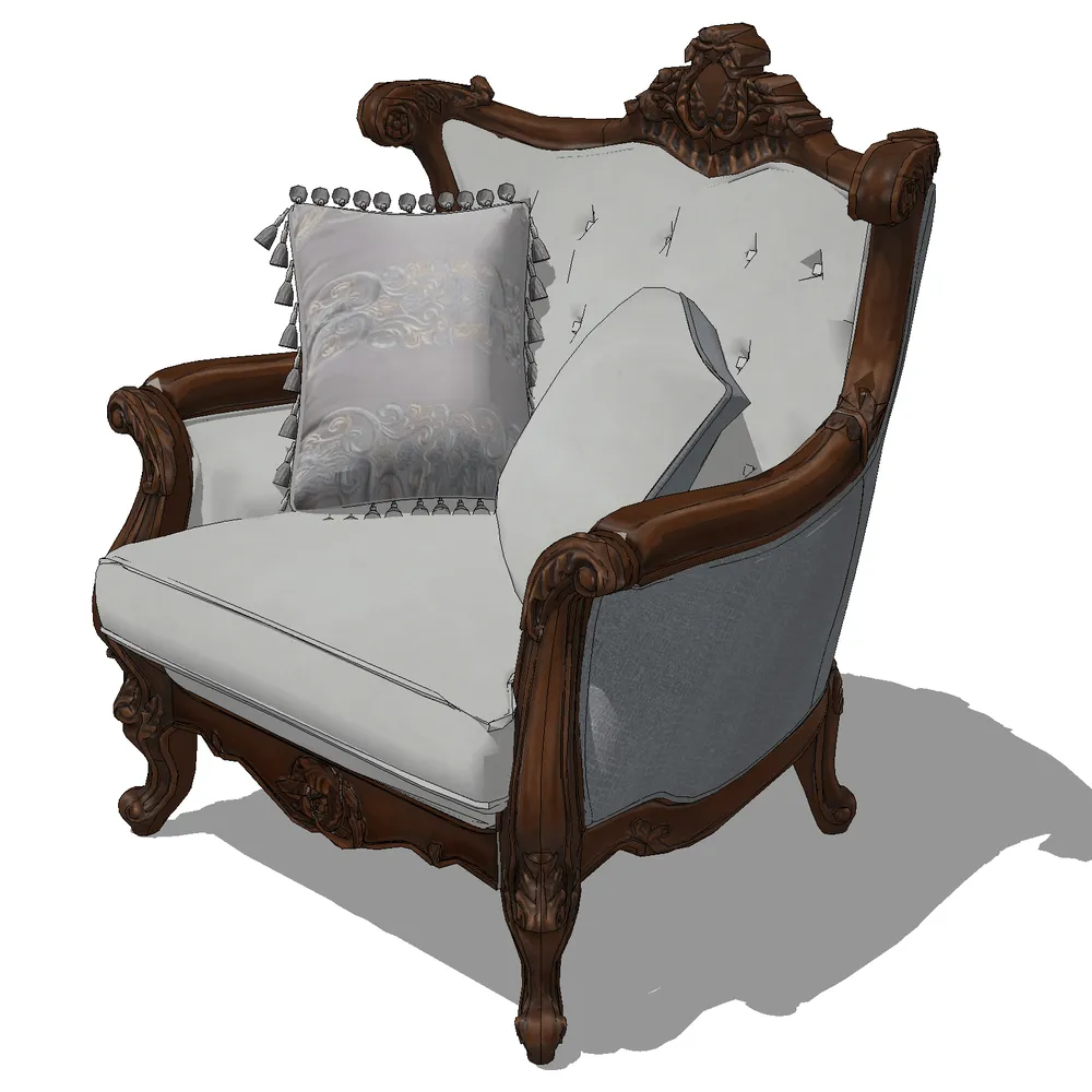 This exquisite vintage armchair, featuring intricately carved wooden details and soft gray upholstery, is the perfect choice for classic interior design projects. Its SketchUp model includes layered textures and ornate decorative elements, making it particularly suitable for architectural visualization and 3D rendering workflows.