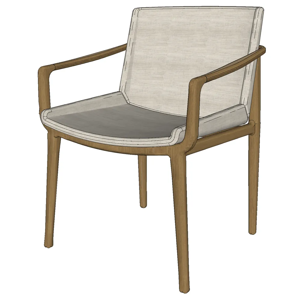 This contemporary armchair 3D model features a minimalist wooden frame paired with a textured woven backrest and upholstered seat. Designed for SketchUp workflows, it combines ergonomic proportions with photorealistic materials ideal for residential interior visualizations.