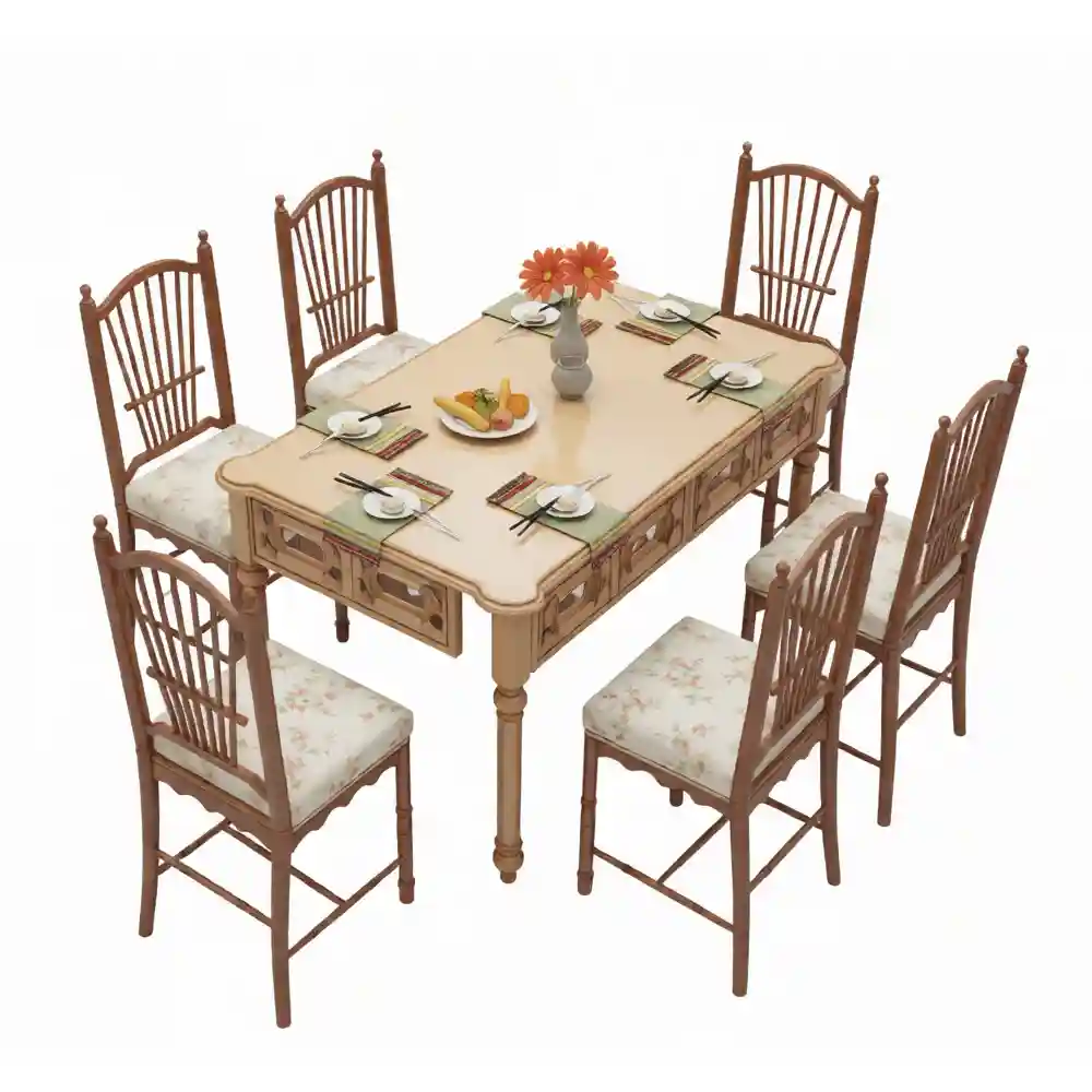 This vintage wooden dining set SketchUp model features intricately carved legs, floral-upholstered chairs, and realistic table settings. Ideal for classic interior design visualizations and 3D rendering projects.