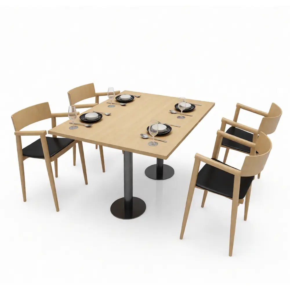 This modern dining table set features a minimalist rectangular table with black pedestal bases and six armchairs with light wood frames and black leather seats. Designed for restaurant interiors and residential spaces, it includes detailed table settings with plates, cutlery, and glassware. Optimized for SketchUp with clean geometry and realistic textures.