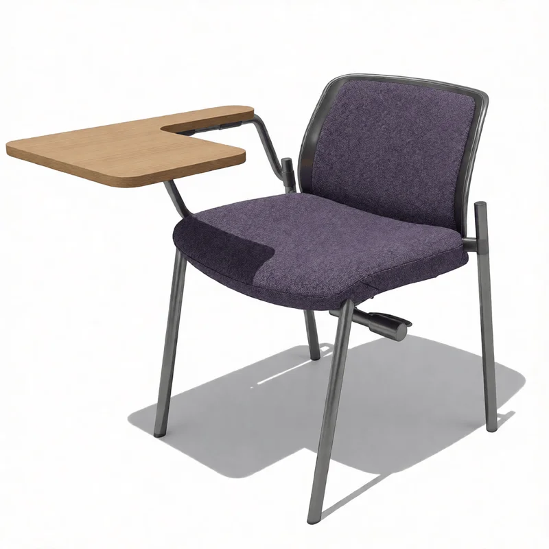 Modern purple fabric office chair featuring a sleek metal frame and integrated wooden writing desk. Optimized for SketchUp 2021 with D5 Render and Enscape compatibility, ideal for conference room and training space visualizations.