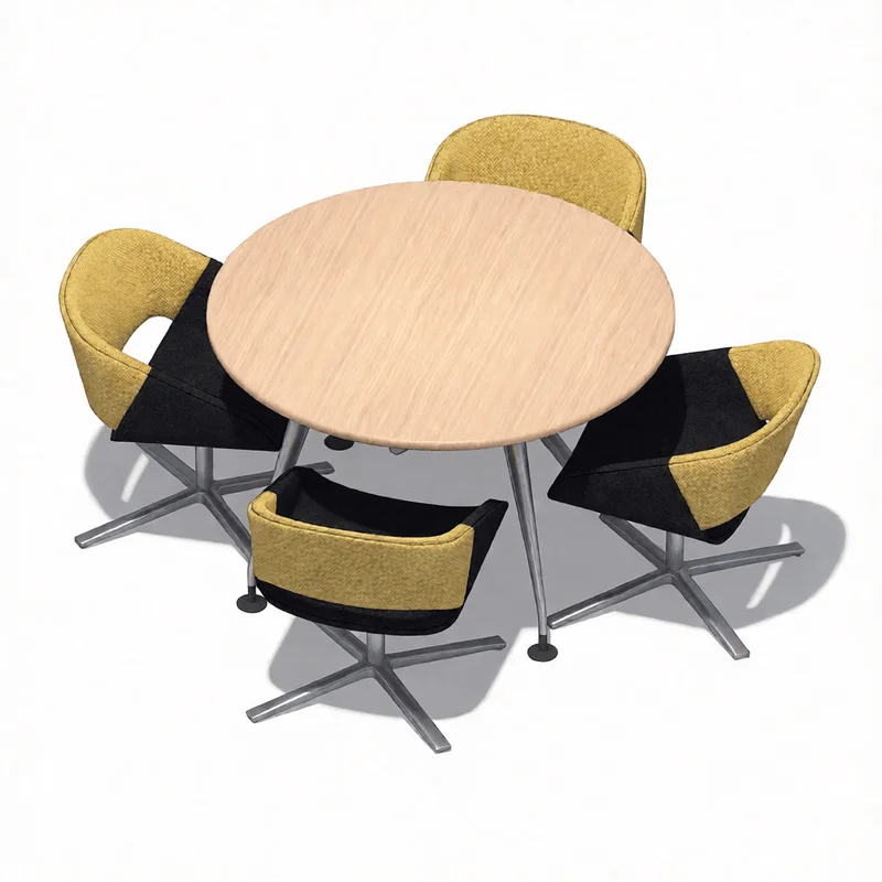 This modern table set 3D model includes a round wooden table and four chairs featuring yellow and black upholstered cushions. Optimized for SketchUp 2021 and compatible with D5render, Enscape, and Vray renderers. The model size is only 1.8MB, allowing seamless integration into interior design projects.