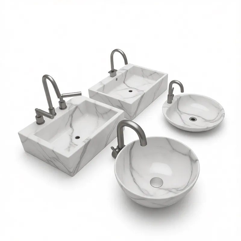 A premium set of four countertop basins in white marble with elegant gray veining, including rectangular and vessel styles with integrated chrome faucets. Optimized for SketchUp 2021 and compatible with D5 Render, Enscape, and V-Ray—ideal for high-fidelity bathroom visualizations and interior design presentations.