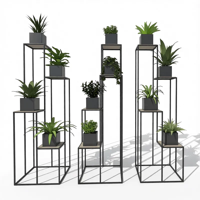Modern geometric plant stand for interior design featuring black metal frameworks and multi-tiered platforms. Optimized for SketchUp 2021 with D5render, Enscape, Vray. Enhances architectural visualizations with realistic foliage integration.