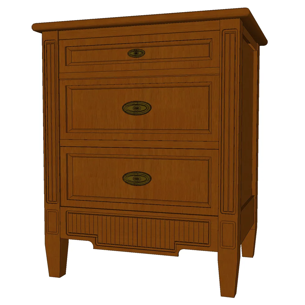 This meticulously crafted 3D nightstand model features a rich walnut finish, three functional drawers with oval inlay accents, and elegant fluted leg design. Perfect for traditional bedroom settings or historic preservation projects, it combines period-appropriate craftsmanship with modern BIM-ready performance.