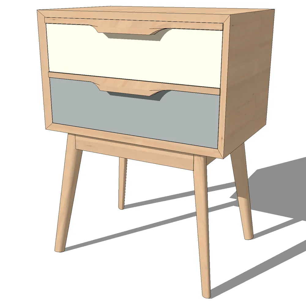 This minimalist bedside cabinet features a light oak frame with two-tone drawers – crisp white top compartment and muted gray lower storage. Tapered legs add sculptural elegance while maintaining functional simplicity. Perfect for enhancing modern bedroom layouts with its clean lines and sustainable material palette.