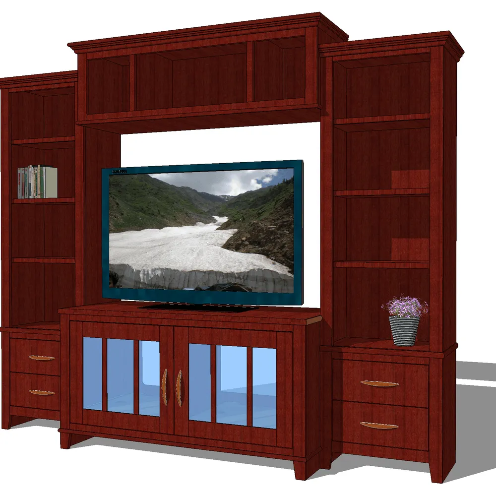 This modular entertainment center features a rich mahogany finish with recessed panel doors, glass-fronted storage compartments, and flanking bookshelves. The asymmetrical design accommodates TVs up to 65″ while offering adjustable shelving and hidden cable management. Ideal for modern or traditional living spaces.