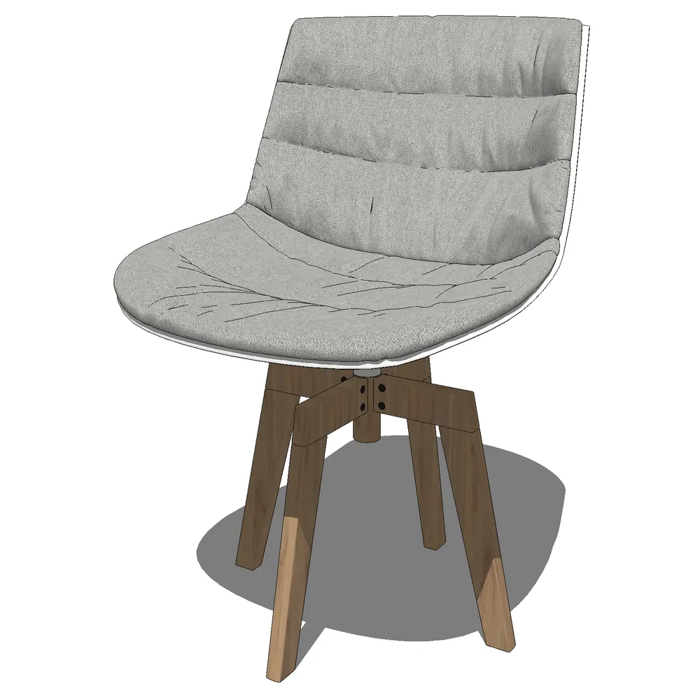 This ergonomic swivel chair features a contoured gray upholstered seat and high-back cushioning with channel-tufted detailing. The minimalist design combines a solid wood base with tapered legs and a central rotation pivot, offering both style and functionality for interior design visualizations.