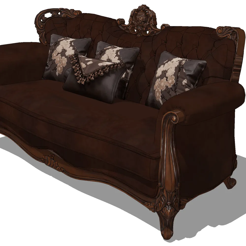 This exquisite luxury ornate leather sofa features intricate carved wood accents and plush seating, perfect for enhancing the elegance of any interior design project. The detailed floral-patterned cushions add a touch of sophistication, making it ideal for high-end residential or commercial spaces.
